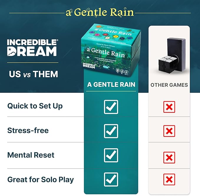- Peace in Every Play: Designed for solo, 2-player, or cooperative play in just 15 minutes, A Gentle Rain offers a mental refresh from high-stress games—no points, no pressure, just mindful presence and quiet connection with yourself or a partner