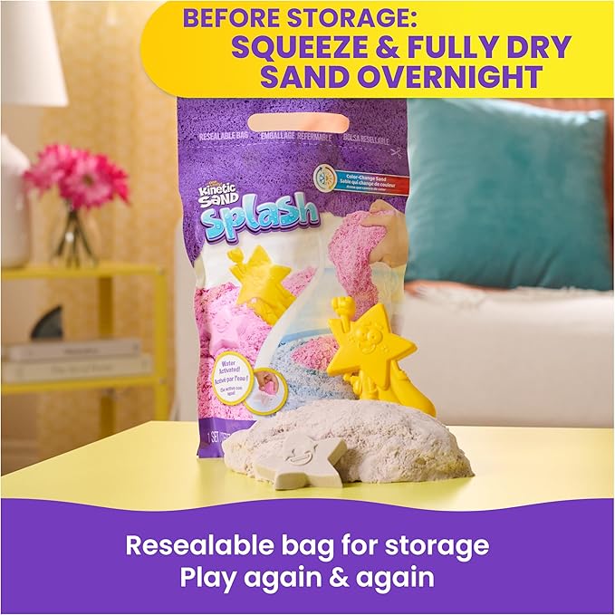 - One & only Kinetic Sand: Like original Kinetic Sand, Splash sand is made from natural sand, is reusable, never dries out & sticks together for easy cleanup. Safe for creative play, sand art & kids crafts.
