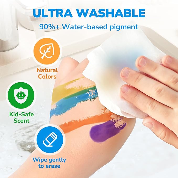- ๐ฆ WASHABLE & MESS-FRIENDLY๏ผ 90%+ washable ink wipes off skin, clothes & tables with water! Fast-drying, vibrant colors with durable sponge tips. Tip: Use wet wipes for whiteboard stains. Non-toxic & ASTM-D4236 certified โ safe for ages 1-3+.