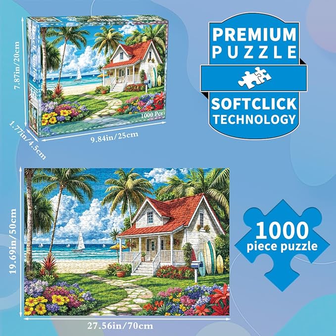 Jigsaw Puzzles for Adults 1000 Piece Puzzle for Adults 1000 Pieces Puzzle 1000 Pieces-Summer Beach Vacation -Surfing, Coconut Trees, Wooden Houses