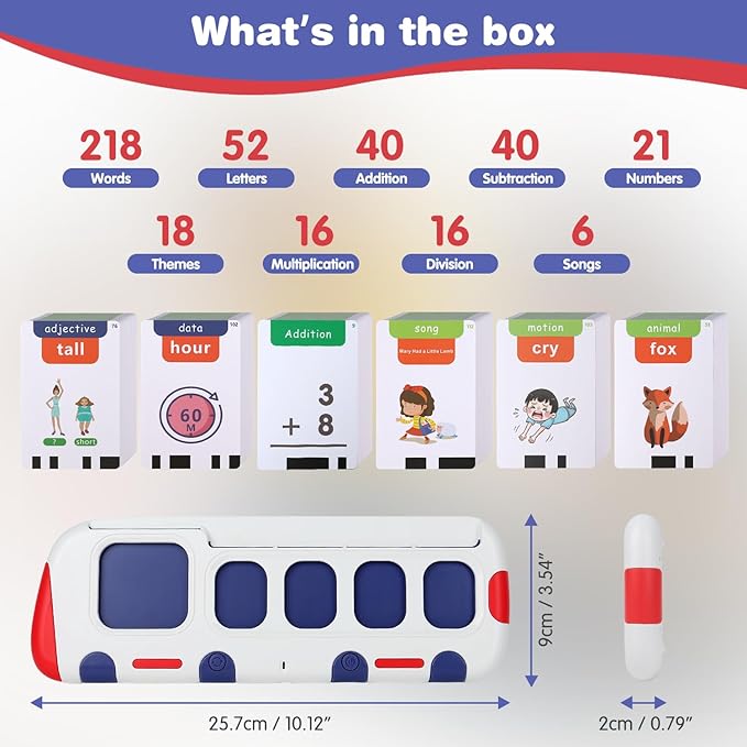 - RICH LEARNING CONTENT: This interactive flash cards set includes a card reader with 218 sight words, 40 addition, 40 subtraction, 16 multiplication, 16 division and 52 letters, 21number, and 6 songs.Its word lists included 15 subjects commonly found in animal, shape, color, body, food, nature, and more.Very suitable for children aged 3-8, not only can they learn daily words but also lay a foundation for mathematics.