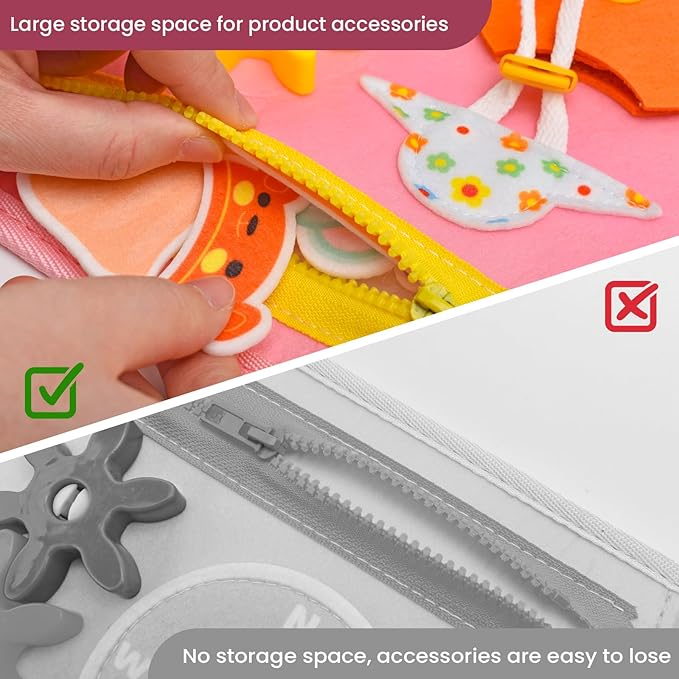 - โจ Master Practical Life Skills: From zippers and snaps to buckles and ties, our busy book transforms everyday tasks into delightful challenges. Kids will love sorting colors, assembling puzzles, and matching shapes, all while developing dexterity and muscle control. Unique additions like gear-turning, time-telling dials, and a pretend dress-up station make learning immersive, blending play with real-world skills. The first-page storage pocket keeps all small pieces neatly contained, teaching organization while ensuring no lost parts.