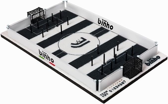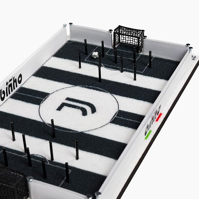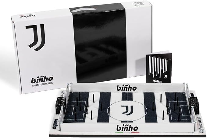 - Complete Set - Create memorable moments with our Binho Board Juventus FC. Each set comes with everything you need: 22” x 13” x 3” Binho board, 2 balls, 2 score pins, 2 red/yellow cards, 2 goals, 20 black metal removable player pieces, 12 barrier pieces, 6 white exterior elastic bands (2 long, 4 short), 1 rules pamphlet, and 1 drawstring bag.