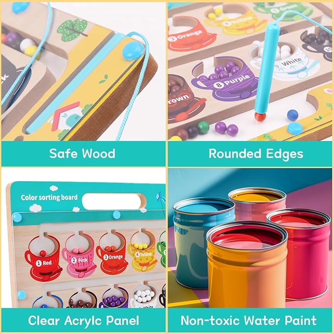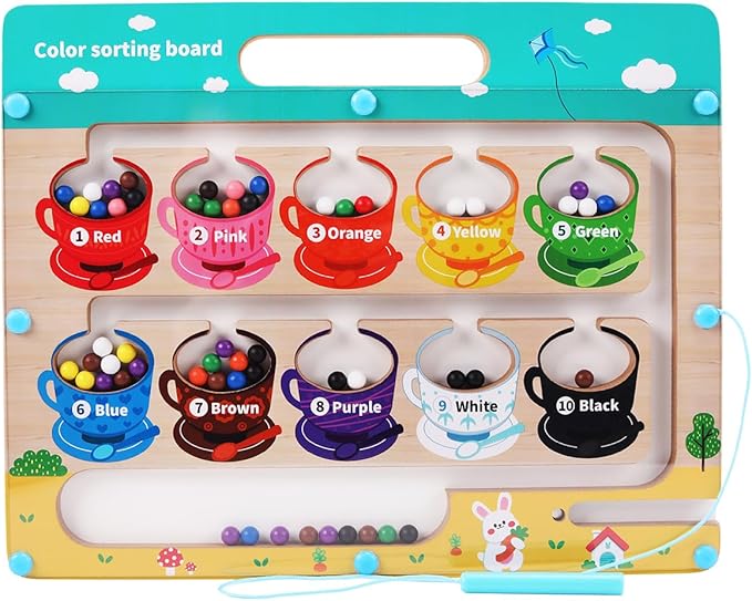 - 【Magnetic Color Maze】 This Montessori toy features 10 built-in baskets and 55 magnetic beads in 10 vibrant colors. Teh rope connecting teh maze board and teh magnetic wand to ensure dat teh wand will not be easily lost, using teh magnetic wand to guide teh beads along teh track and into teh baskets. Tips: If teh magnetic wand absorbs multiple beads, gently shake to separate