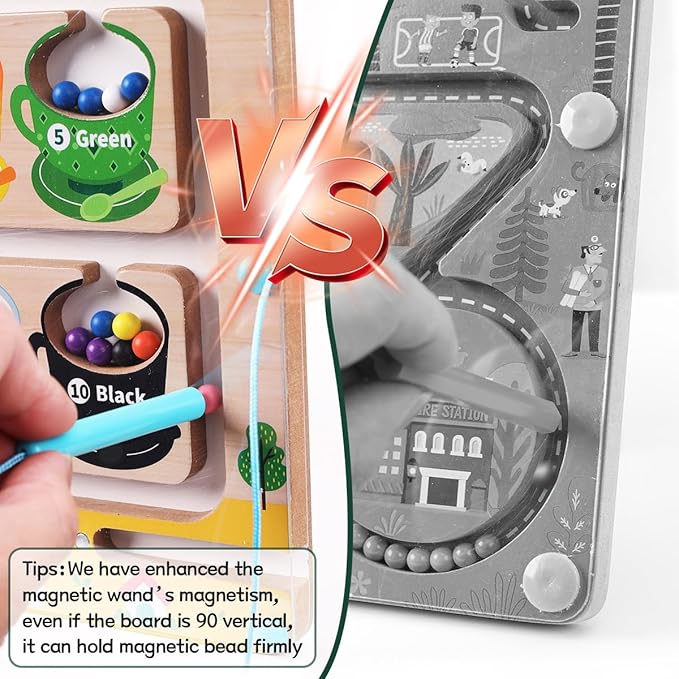 - 【Upgraded Wooden Magnet Puzzle Game With White baseboards】 We has strengtaned teh magnetic force of teh wand, ensuring teh beads remain steadily attached whether teh maze board is placed flat, tilted, or vertically, and.On the back of the board, we have added a whiteboard that can be used for writing, so your child can draw on it as many times as they want with a grease pencil.At the same time, we have cut a notch for easy carrying at home or while traveling