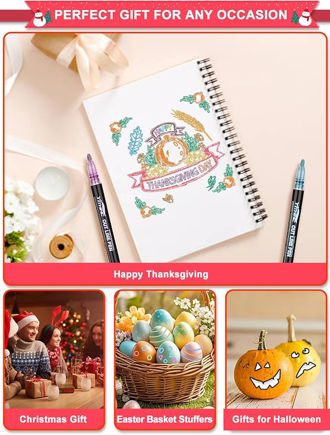 - ✔ 3 UNIQUE WRITING EFFECTS – Designed with a special outline feature, these cool markers deliver three creative results. On light or white paper, they produce dual lines: metallic silver with a colorful outline. On dark or black paper, only the silver stands out. On smooth surfaces, you’ll see the colorful ink alone. For the best results, we recommend using thicker paper or placing an extra sheet underneath your project.