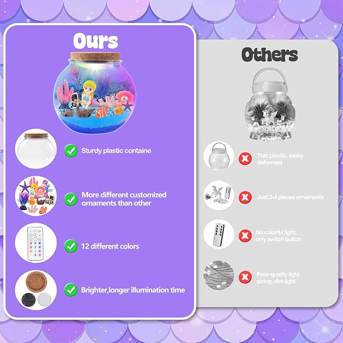 - 【Mermaid Garden DIY Night Light Kit】 Our mermaid terrarium kit includes everything needed to create a magical underwater mermaid garden: a clear jar, a 13-color LED night light, a remote control, adorable mermaid doll, sparkling crystals, magic sand, clown-fish, flatfish, shell, coral, wreck, treasure chest, etc. This comprehensive set provides your child with a delightful and imaginative crafting experience.