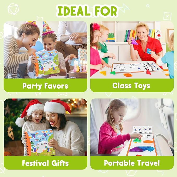 - Magnetic Travel Tangram: This set contains 7 magnetic tiles, a solution booklet, two marker pens (black and blue), and a magnetic whiteboard base. The included portable bag makes it perfect for travel, allowing kids to create endless patterns on the go.
