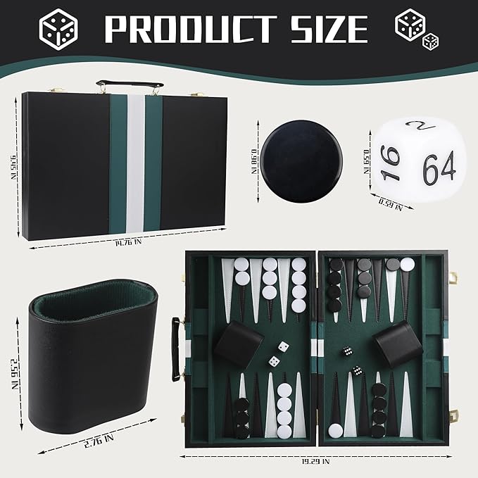 - 【Perfect Size for Travel】: Folded dimensions: 15 x 9 x 2 inches; Open: 18 x 15 x 1 inches. This portable backgammon set offers the ideal size and weight for travel, vacation, and quick setup anytime, anywhere.