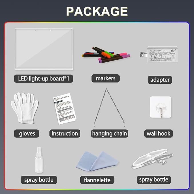 - COLORFUL LED LIGHTING AND MULTIPLE MODES: This led writing board is equipped with 7 different LED light colors and 4 light modes, fixed with plug-in adapter to avoid the hassle of hogging your own charging head, press the adjustment button to customize the color ambience to fit any mood or environment. led dry erase board Whether it's for work, study, or decorating, you've got your choice! perfect colors and patterns to enhance your space.