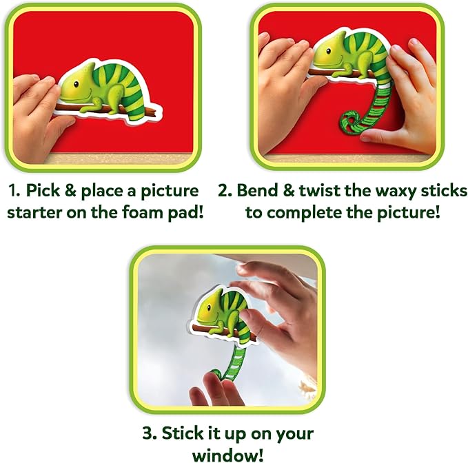 - CREATIVE WINDOW ART!: This mess-free, fun, and easy activity encourages creativity and artistic exploration! Kids can use 100 colorful, bendy, twisty waxy sticks to create 15 amazing animal pictures!