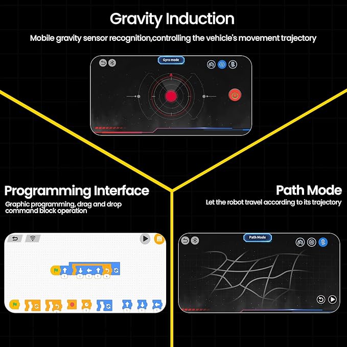 - Dual Remote Control Modes:Control your robot via remote or app with four exciting modes: Remote Control, Path Mode, Gravity Sensor, and Programming Control. Move in all directions—left, right, forward, backward, and 360° rotations—on smooth indoor or outdoor surfaces. Easy to use and packed with interactive features, it guarantees hours of engaging play.