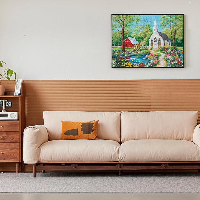 - 500-Piece Puzzle – Escape into a peaceful countryside scene featuring a white church surrounded by blooming flowers, lush trees, and a gently flowing river. This charming puzzle brings natural beauty to life—perfect for relaxing moments, stylish décor, or a heartfelt gift