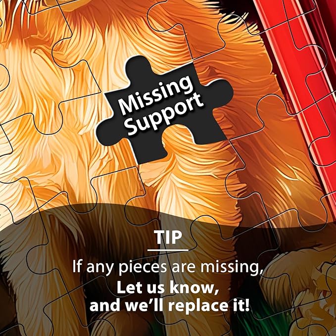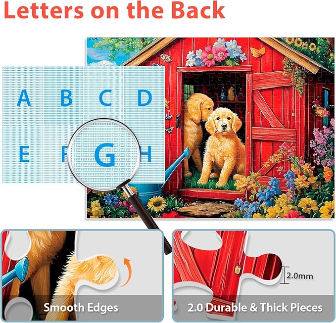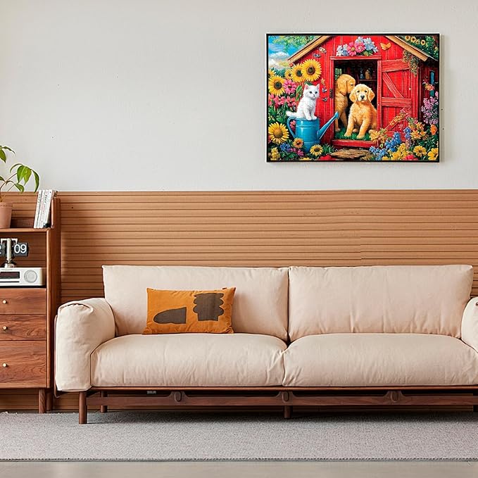 - Fun Puzzle Imagery: A cozy red house with two golden retrievers at the door, a curious cat on a watering can, and vibrant sunflowers all around. Warm, joyful, and full of charm—perfect for animal and nature lovers!