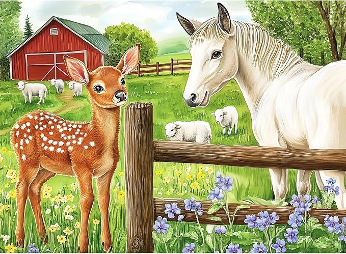 - [Farm Deer Jigsaw Puzzles]: This jigsaw puzzle features a vibrant farm scene, where a cute fawn stands near a wooden fence adorned with flowers. In the background, a white horse and several sheep graze on a lush green meadow. A red barn adds charm to the peaceful rural setting