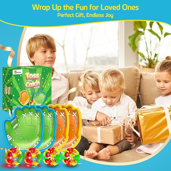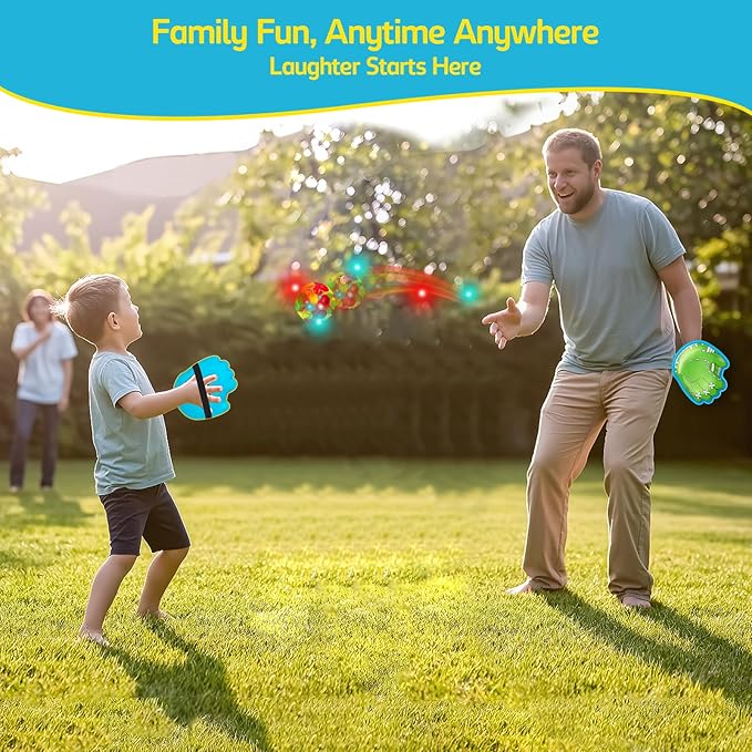 - [Exciting LED Toss and Catch Ball Game Set] Bring endless fun to your kids with this interactive toss and catch ball set! Featuring glow-in-the-dark LED suction cup balls and easy-to-grip gloves, this outdoor toy is perfect for summer activities at the pool, beach, or backyard. The LED lights add a magical touch for nighttime play.