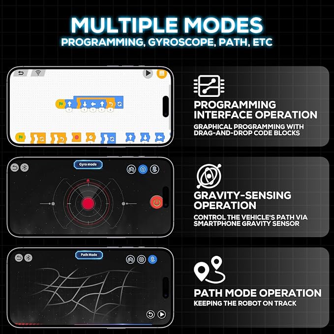 - Dual Remote Control Modes:Control your robot via remote or app with four exciting modes: Remote Control, Path Mode, Gravity Sensor, and Programming Control. Move in all directions—left, right, forward, backward, and 360° rotations—on smooth indoor or outdoor surfaces. Easy to use and packed with interactive features, it guarantees hours of engaging play.