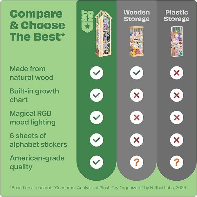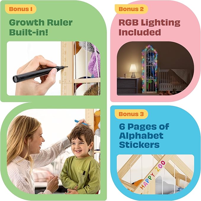 Stuffed Animal Zoo Storage Cage | Wooden Plush Tower Storage | Durable Plush Toy Stuffie Holder | Vertical Jail Organizer with Height Ruler, Stickers & RGB Light (Large)