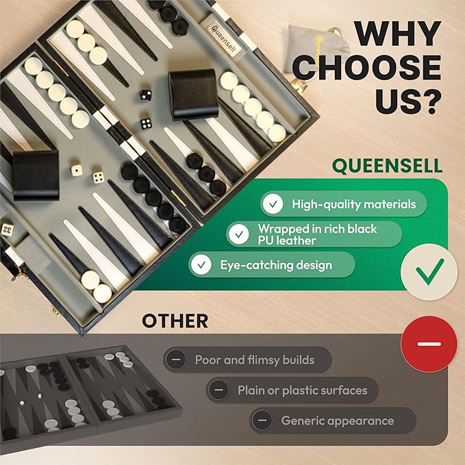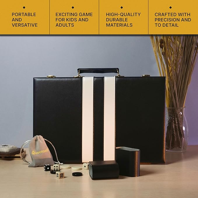 - Premium Quality PU Leather Backgammon Set – Durable construction, neatly stitched edges, and fitted compartments for dice, checkers, and cups make this board game set both functional and visually striking