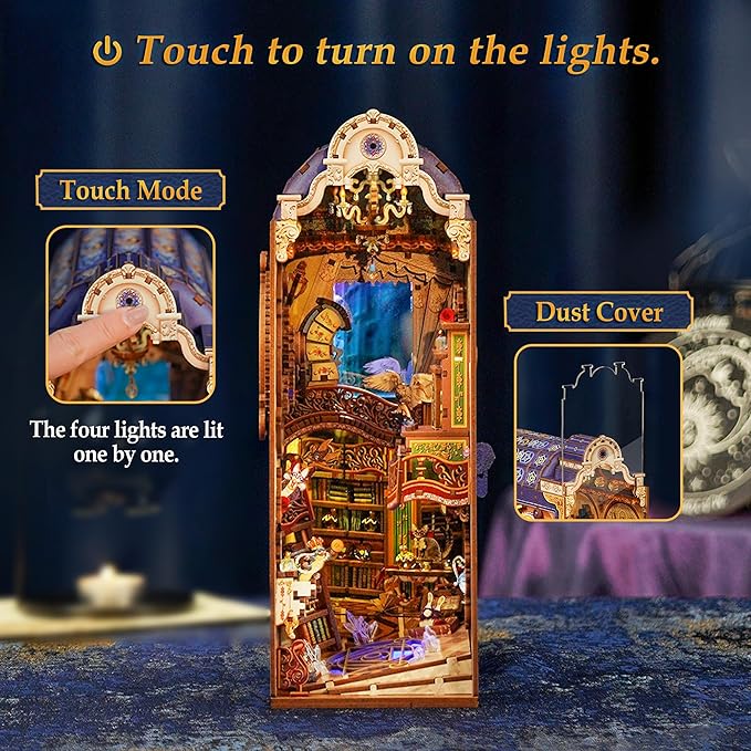 - Fun Details: Tonecheer DIY book nook kits comes with four kinds of lights that light up one by one when you touch the button. The booknooks kits for adults also has a variety of interactive parts, the gear that controls time, the bird that delivers letters, the double-sided sculpture and more for you to discover.