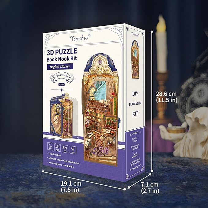 Tonecheer DIY Book Nook Kit for Adults, 3D Wooden Puzzle Bookend Miniature House Kit, Booknook Bookshelf Insert Decor with Dust Cover and LED Lights Gifts (Magical Library)