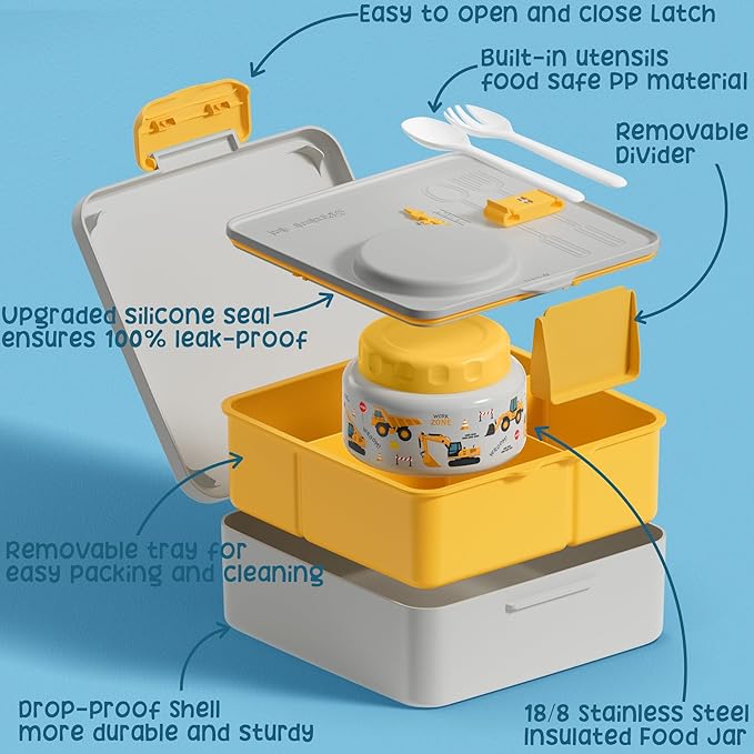 - Premium & Kids-friendly Lunch Box: Bento box kids is made of premium BPA free ABS/PP plastic & silicone material which is odorless, non-toxic, safe & healthy for kids. Insulated food jar is made of 18/8 stainless steel, which is fully resistant to oxidation & corrosion. Drop-proof shell is durable, sturdy and not easy to break. Kids friendly latches designed make it easy for your child's small hands to open & close. Designed with a durable handle, kids can easily carry it on-the-go