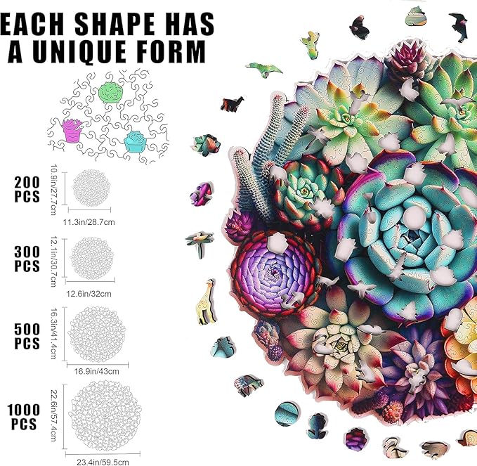 - *Fun Challenging: Mandala Succulent World wooden jigsaw puzzle for kids and adults includes 300 Pcs Unique 3D Shape, each piece Thickness 5mm, almost as thick as 3 quarter coins pile up, easy to hold. finished size is 11.2''x15.9'', Premium Wood puzzle Cool present Intersting gift.