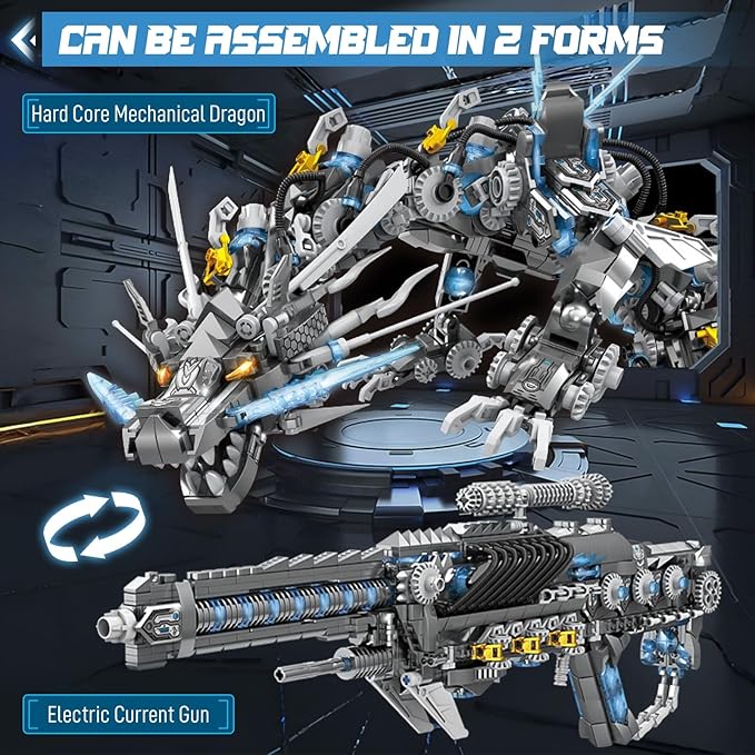 - 2 in 1 Novelty Design: The eyes, mouth, teeth, antennae, and dragon scales mechanical parts of the dragon are designed to be lifelike. Multiple joints can rotate flexibly, creating various postures and emitting a domineering and powerful aura. This kit can also be transformed into an electric current gun, with high playability