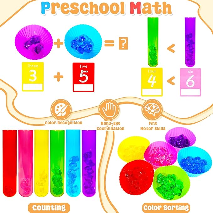 - Versatile Sensory Kit: This set includes rainbow test tubes, acrylic gems crystal, sorting bowls, cups, and tools. All necessary accessories included