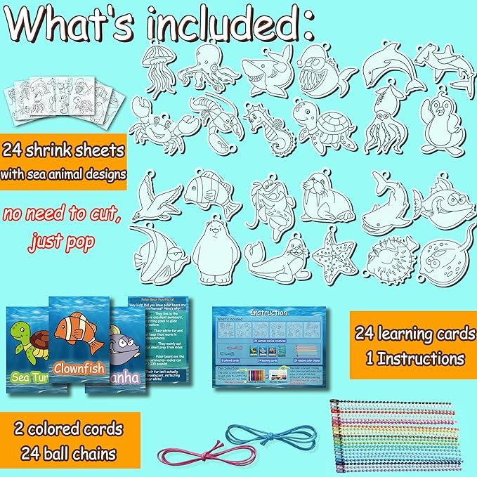 - 2. Comprehensive Learning Experience: Our Shrink Art Kit includes 24 educational learning cards and a detailed instruction guide, making it a perfect DIY craft activity. The learning cards provide step-by-step guidance, helping children develop creativity, fine motor skills, and problem-solving abilities while having fun. This all-in-one kit ensures a seamless and engaging experience for both beginners and young craft enthusiasts.