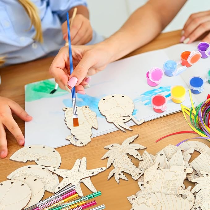- What You Get: 30 pieces wooden summer wind chimes have 10 different shapes and sizes, gnome, watermelon, coconut, beach, hawaii, starfish, swim ring and so on, 3 pieces in each style, 90 pieces wind chime tubes available, comes with silk thread, stickers and paint; Abundant quantity is enough to meet the needs of children's various activities, so that kids can create their own summer wind chimes wooden crafts, improve kids' creativity