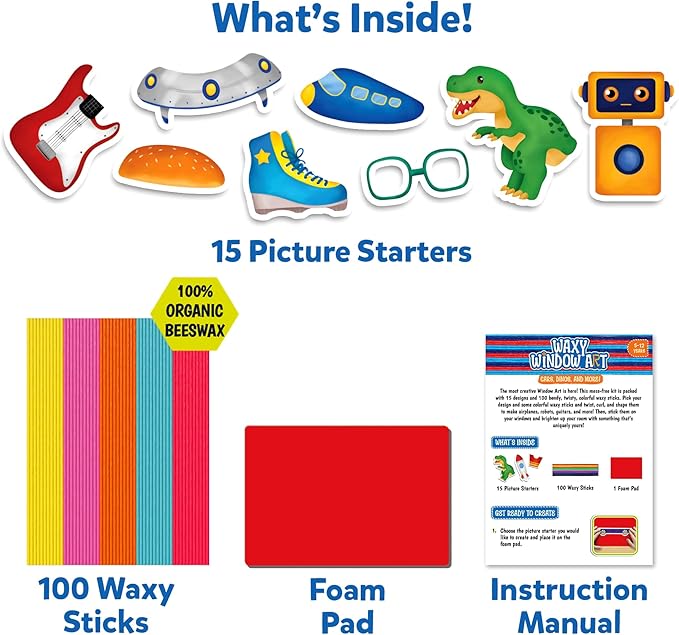 - INCLUDES: 100 Waxy Sticks (100% Organic Beeswax), 15 Picture Starters, 1 Foam Pad, and an Instruction Manual.
