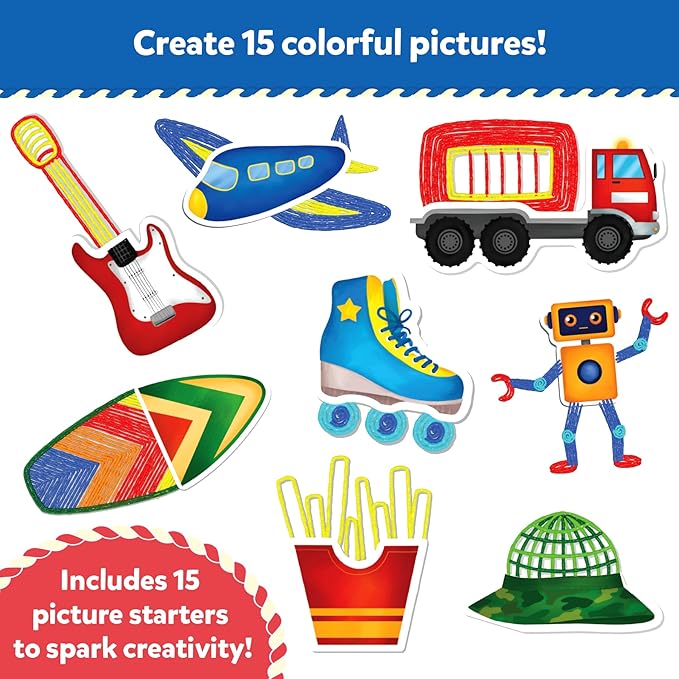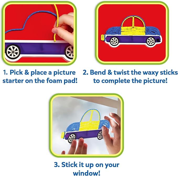 - CREATIVE WINDOW ART!: This mess-free, fun, and easy activity encourages creativity and artistic exploration! Kids can use 100 colorful, bendy, twisty waxy sticks to create 15 exciting pictures of airplanes, robots, guitars, and more!