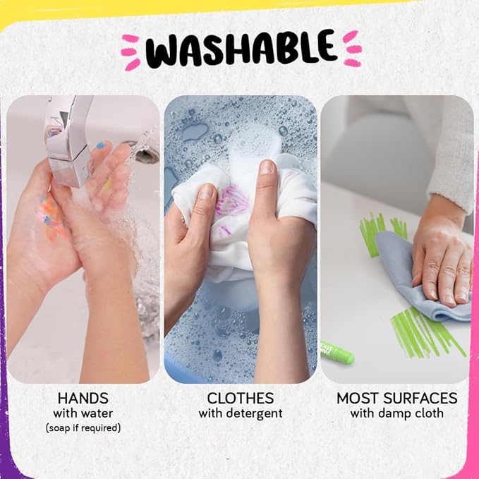 - Non Toxic, Mess Free, Quick Drying - No water, no brushes, no paint spills or stains! Easily washable from childrens hands, clothes & surfaces. Just twist & draw like a crayon. Perfect toddler art supplies for kids daily creative activities.