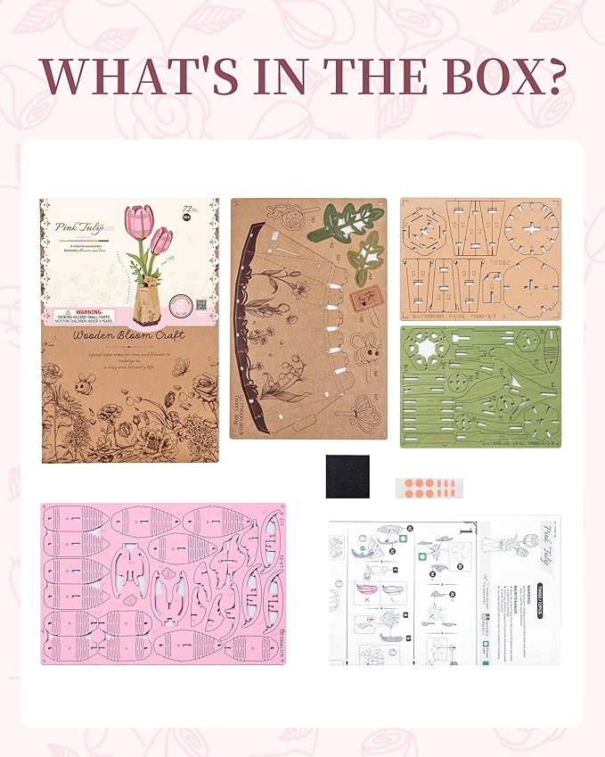 - 【Wooden Puzzle Pink Tulips】Pink tulips symbolize eternal happiness, tender love and precious blessings.Send the Wowood 3D Wooden Puzzle Pink Tulip to your beloved, with the refined carved wood to freeze the blooming time, symbolizes that the sincere friendship is like a flower blooming forever.