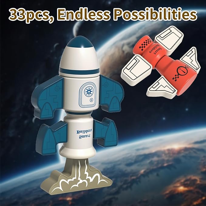 - 【33-Piece Rocket Robot DIY Kit】Unlock endless possibilities with 33 magnetic pieces! Kids design unique rocket robots from scratch—no instructions needed. Bend, stack, and rebuild freely for pure open-ended STEM play!