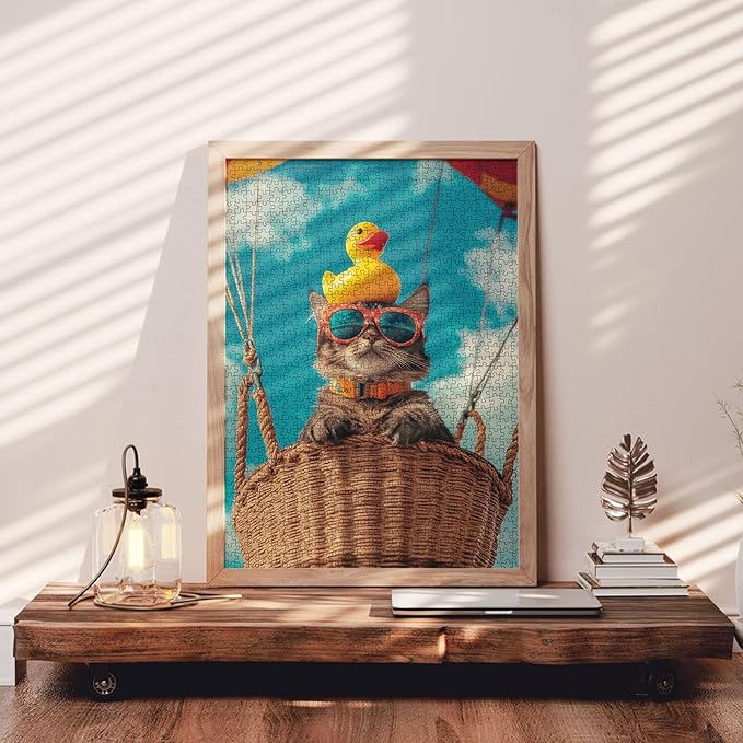 Cute Cat Wearing Colorful Lenses Jigsaw Puzzle 1000 Pieces for Adults, Skydiving in The Air Art Puzzles Colorful DIY Crafts Puzzles for Home Decor Gifts, Family Challenging Perfect for Game Nights