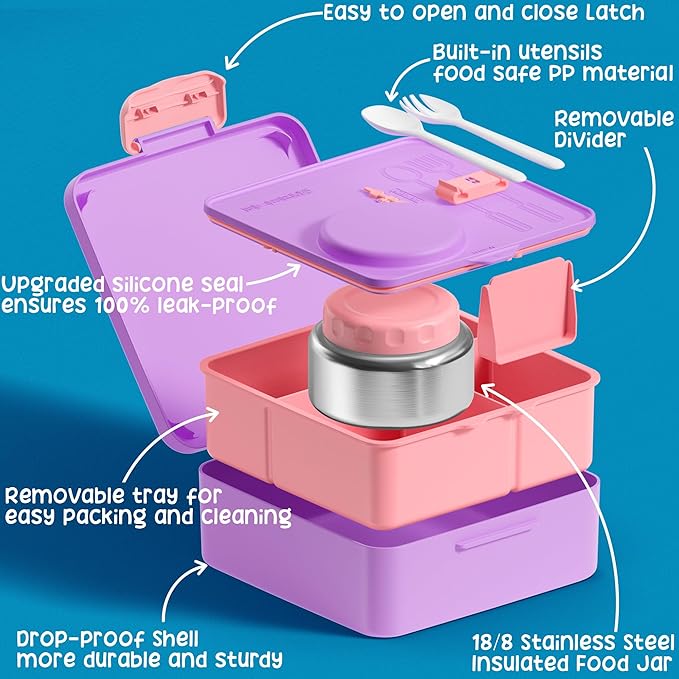 - 100% Leakproof Bento Box for Kids: Say goodbye to spills! Our patented middle lid locks in liquids with an upgraded silicone seal, ensuring 100% leak-proof while keeping forks and spoons neatly tucked away! And here's the kicker: kids lunch box with 3/4 compartments features removable dividers and individual silicone seals that keeps juices in and flavors pure. Bye-bye, food flavor mashups! Ideal for packed lunches whether you're hitting the classroom or the trail