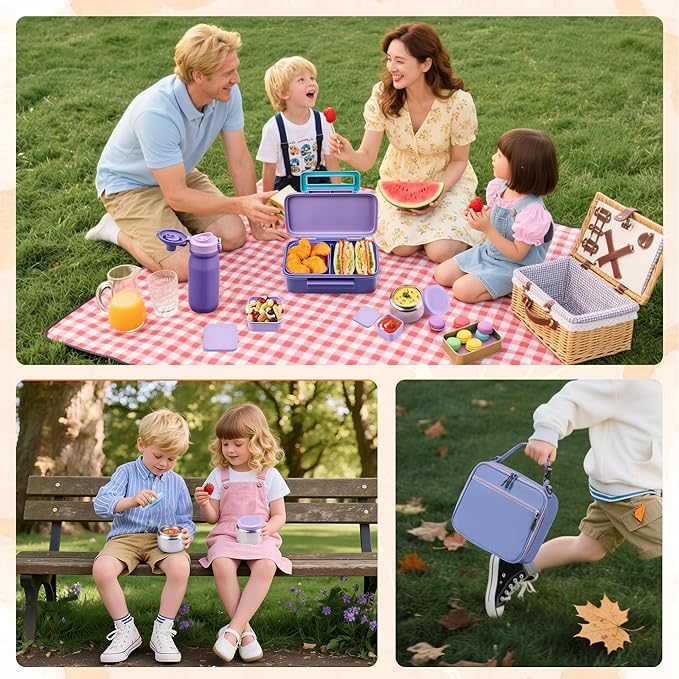 - ๐ฑLUXURY KIDS BENTO LUNCH BOX SET - You will get: 1 lunch box kids, one insulated food jar, one lunch bag, two food dividers, an ice pack , and a of insulated water bottle.This kids lunch box features a leak-proof silicone seal and secure latch to keep food fresh and prevent spills.