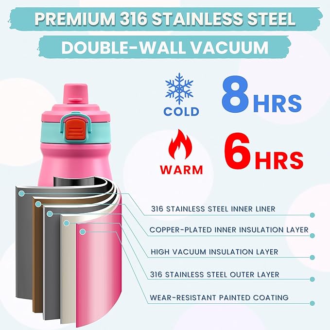Kids Lunch Bento Box with Thermo Ice Pack Food Container with Insulated Lunch Bag, Insulated Water Bottle with Straw for Girls Boys,Pink