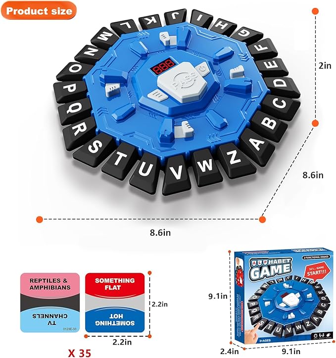 - ๐How To Play - Choose a card with a category, press the pass key, the LED display will light, and shout out words related to the category that start with a certain letter. Once the related word is announced, press the corresponding letter tab.