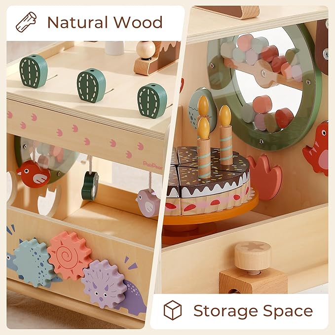 - Dinosaur World on Wheels:Six sensory games in one push cart: bead-volcano, egg slider, cactus pegs, dino gears, bird-grab string & shape sorter keep curiosity blooming long past first steps,all contributing to early learning and motor skills development