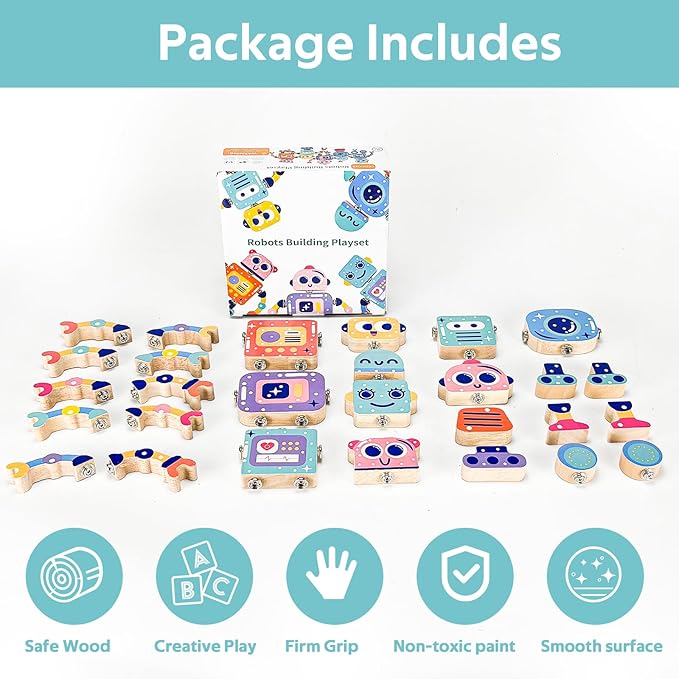 - 【Creative Robot Building Fun】 This STEM toy set includes 28 durable wooden pieces that kids can mix and match to build unique robot characters! Interchangeable heads, arms, legs, and bodies encourage open-ended play, sparking creativity and imagination while offering endless building possibilities.