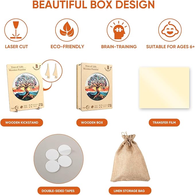 - 500-Piece Serenity Tree---This wooden jigsaw puzzle for adults features 500Pcs brightly colored and irregular wooden puzzles, each with a unique shape, are hidden in the graceful curves of branches and leaves, transforming your puzzle-solving into a meditative journey through the glorious seasons of nature. Suitable for adult enthusiasts of wooden life tree puzzles