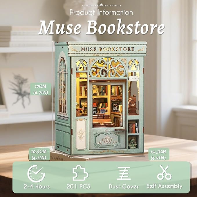 - 【Unique Designed Book Nook Kit - Muse Bookstore 】The 3D puzzle kit is a tiny diorama kit fits between books on a shelf, creating a little scene. The booknook is relate to a bookstore theme, it has LED lights, miniature books and miniature utensils to make the book nook more funny