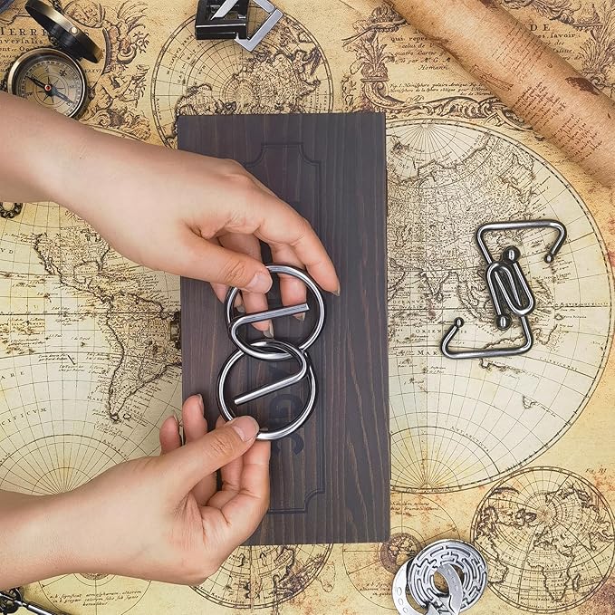- Premium Quality & Portable Storage: Crafted from durable metal alloy, these puzzles are built to last. The set comes in a sleek, fully rounded wooden box (10"x4.7"x2.3", 900g) with a secure latch, making it ideal for travel, gifting, or stylish display