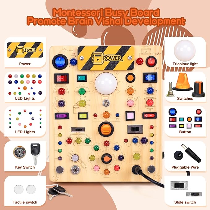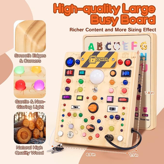 - Bigger Size, Bigger Fun: 30% larger than standard boards, this premium LED busy board sparks curiosity with 19 interactive switches and 40 vibrant LED lights - all carefully calibrated to be gentle on little eyes (no glare or dimness). Featuring a master power switch to conserve battery life, plus 26 alphabet letters, 10 numbers, and 8 colors printed on the back, it transforms playtime into learning time.