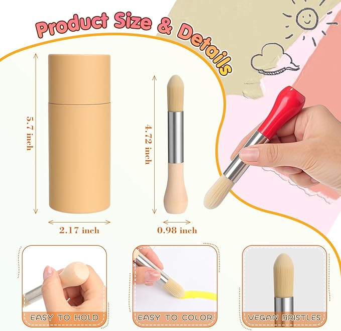 - Quality Material: these paint brushes for kids made of made of vegan materials and does not contain any animal fur; The washable paint brushes apply the quality wooden materials smooth and sturdy, and the connection between the round wooden handle and the brush is made of quality metal and will not break easily; The handy storage containers are made of kraft paper, durable and lightweight
