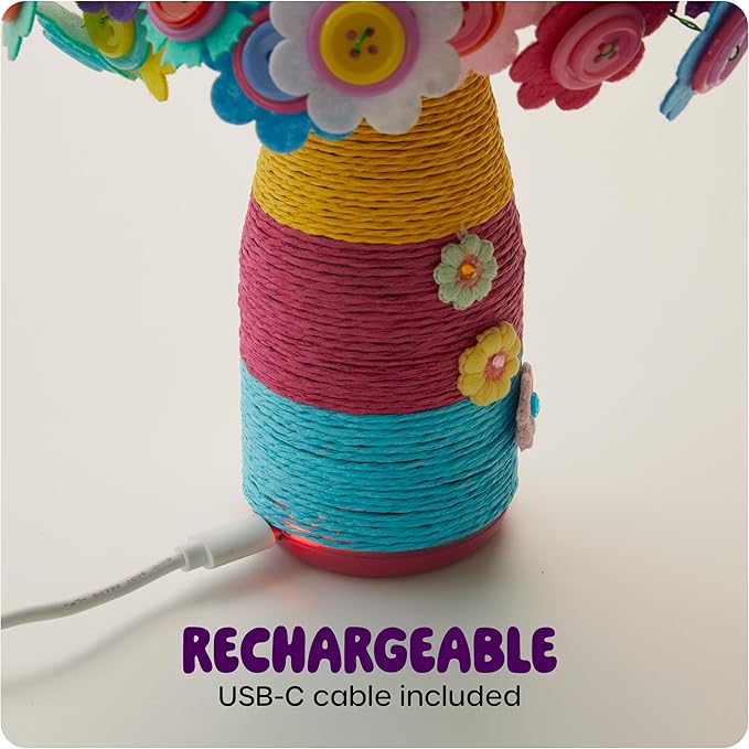 - COMPLETE KIT: Unpack the fun! Includes a light-up vase, large and small buttons, colorful felt flowers, decoration flowers, sparkling gemstones, craft strings, iron wires, double-sided tape, and a charging cable.