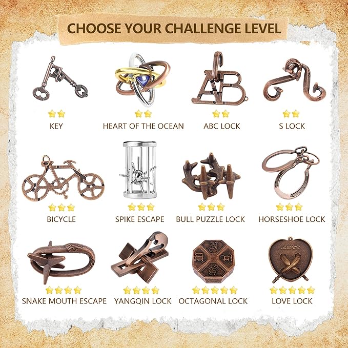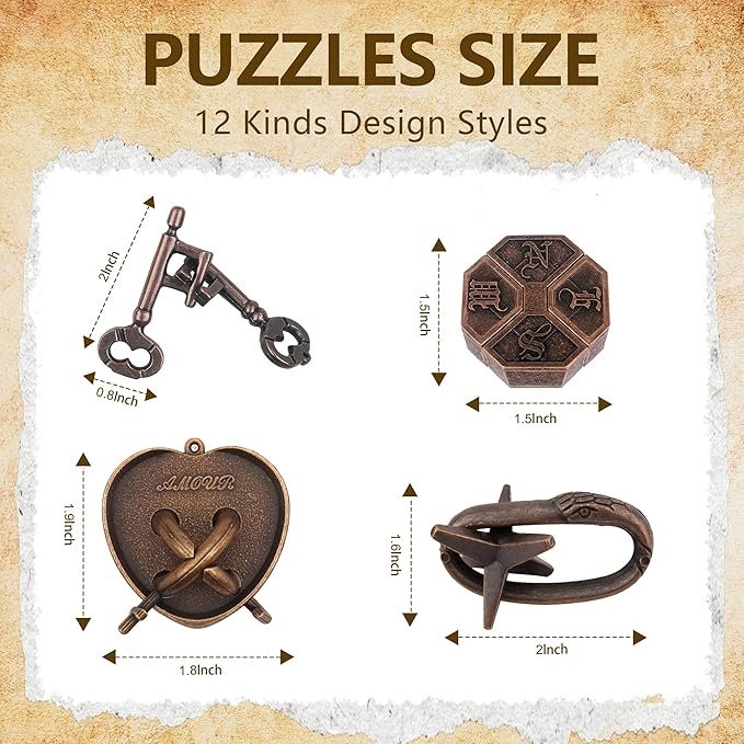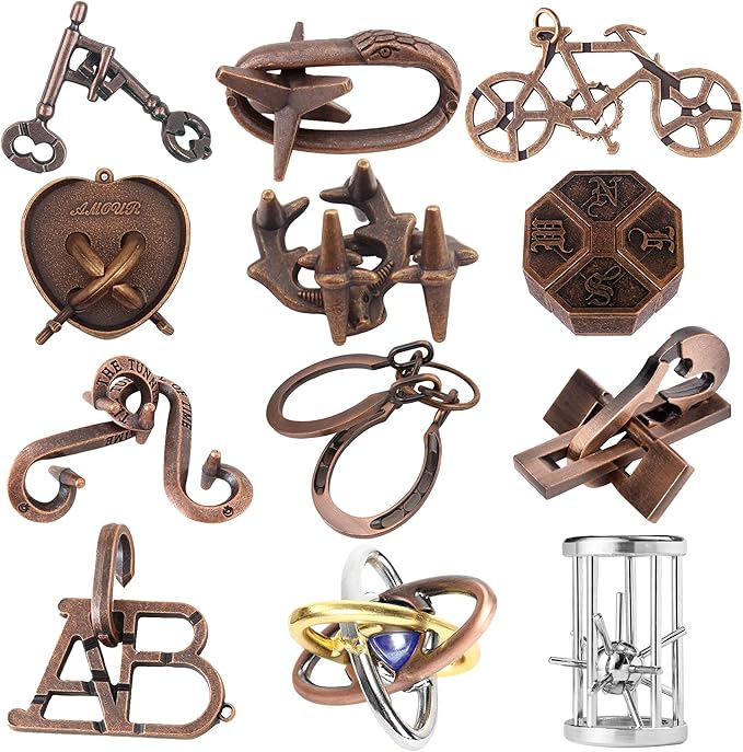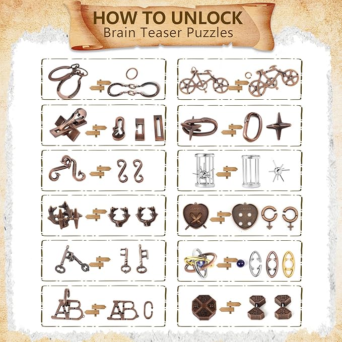 - 【12 Pcs Brain Teaser Puzzle Set】This set includes 12 different 3D metal puzzles, each with its own unique design and difficulty level. Perfect for those who love a good challenge, these logic puzzles help enhance problem-solving skills, concentration, and patience(For a smooth unlocking experience, we've included a detailed video guide demonstrating the solution process for each puzzle. Please check the product videos section below the images!)